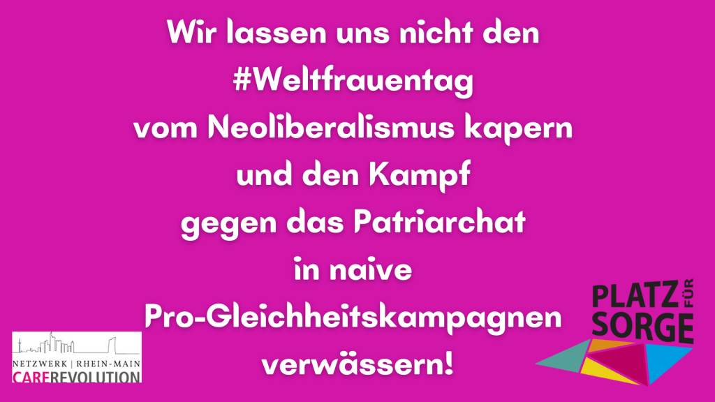 Wir kämpfen dafür, dass Sorge den zentralen Platz in der Gesellschaft zugestanden wird, der ihr verweigert wird, weil das System, in dem wir gefangen sind, nicht den Menschen und das Leben in den Mittelpunkt stellt, sondern Profit und Gier. Und weil Profit und Gier voraussetzen und gleichzeitig verursachen, dass es immer mehr Ungleichheit gibt und gerade die, die die größten Kosten tragen, externalisiert, unsichtbar gemacht und an den Rand gedrängt werden: zum Beispiel Alleinerziehende, Pflegende Angehörige, Mütter, rassifizierte Menschen, Menschen mit Behinderung, Alte.. ehrenamtlich Tätige. Aber auch unsere Umwelt.