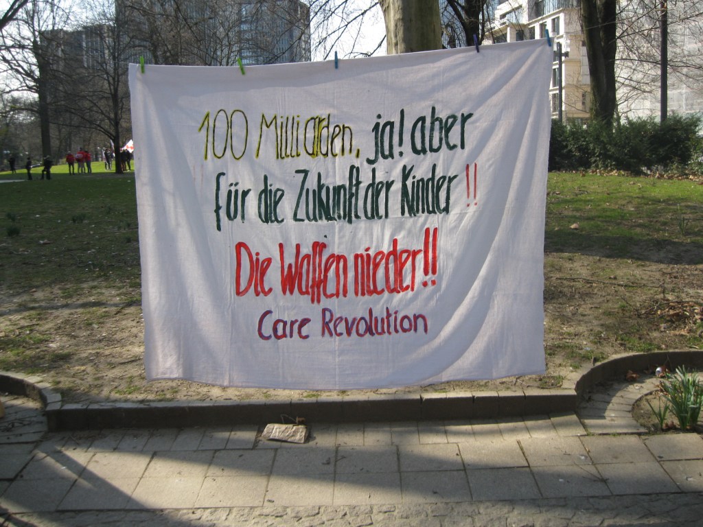 Die Care Revolution-Gruppe aus Frankfurt hat heute erneut gegen Krieg und Gewalt demonstriert. Bereits für den 8. März hatten wir ein Banner gefertigt, um den Kampf der Sozialarbeiter*innen und Erzieher*innen zu unterstützen. Care-Berufe – überhaupt Care-Arbeit, bezahlt oder unbezahlt – muss aufgewertet werden.