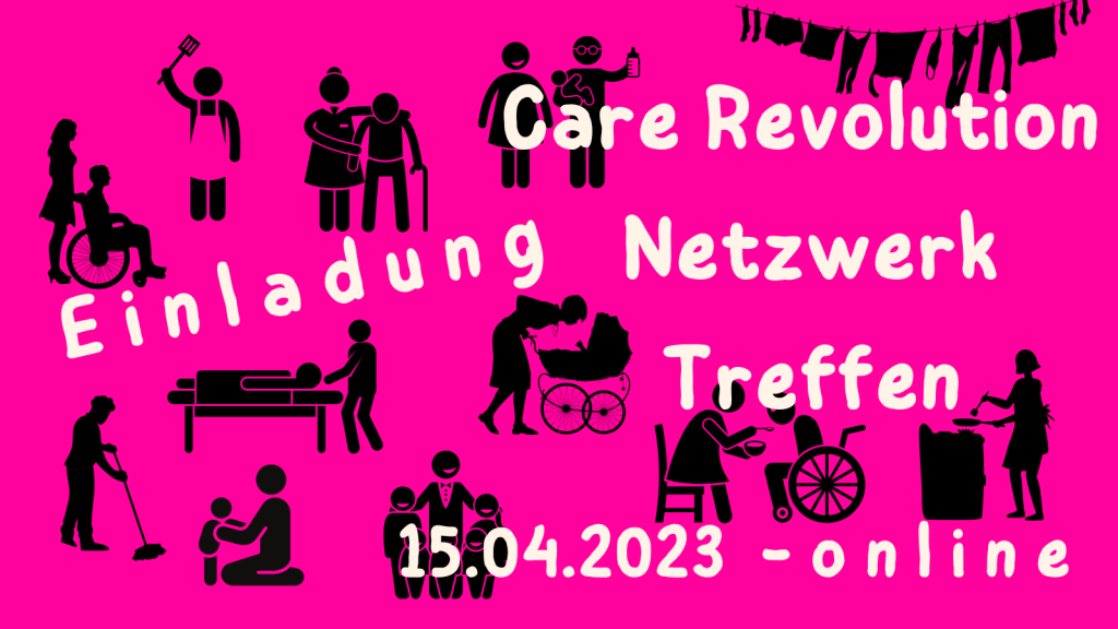 Bei unserem nächsten Netzwerktreffen wollen wir uns fragen, was jede*n von uns motiviert, sich für eine Care Revolution einzusetzen? Und wir möchten zusammen erarbeiten, worin der Mehrwert des Netzwerks für die Arbeit der Regionalgruppen besteht, was die Regionalgruppen erwarten und was sie erhoffen, wenn sie sich als Teil des Netzwerks sehen.