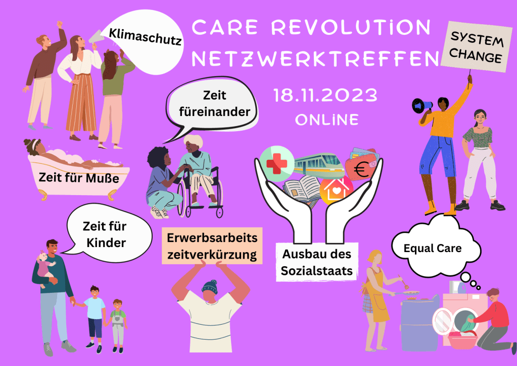 15:15 Arbeitsgruppen. Vorgesehen u.a.: „Träume teilen.“ Was einzelne wirklich gerne im und mit dem Netzwerk tun würden; Ideen zum Event „10 Jahre Care Revolution im Herbst 2024 in Leipzig“; Care, Klimagerechtigkeit und Vergesellschaftung; Mehr Zeit für Care: Erwerbsarbeitszeit verkürzen! Macht auch eigene Vorschläge!