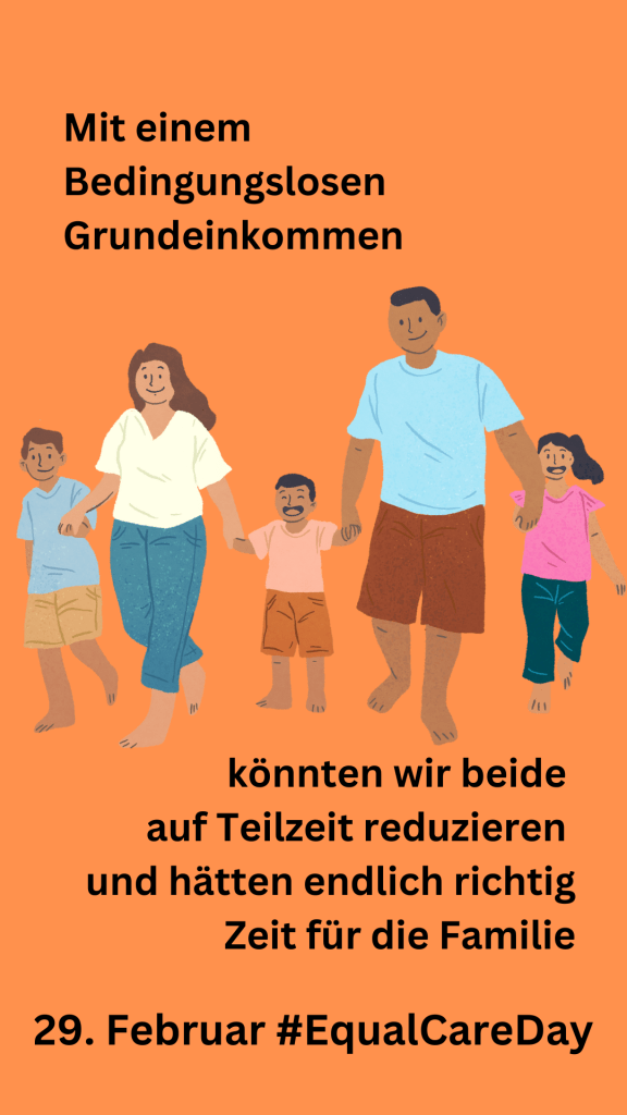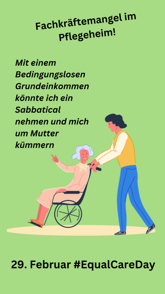 Warum nicht eine Maßnahme wie das Bedingunglose Grundeinkommen einführen? Es wäre eine individuelle, lebenslange existenzischernde finanzielle Absicherung, die den Menschen ermöglichen würde, selbstbestimmt ihre Zeit einzuteilen und die Aufgaben auszuführen, die sie sinnvoll und notwendig finden. Es würde vielleicht endlich klar, dass Arbeit nicht unbedingt eine Ware sein muss. Dass Beziehungen (Sorgebeziehungen) nicht kommodifiziert werden müssen. Es würde auch den Druck vermindern, weiterhin viel zu viel Waren zu produzieren, die Energie und Ressourcen verbrauchen, um ausreichend Erwerbsarbeit zu haben, damit Menschen ihre Existenz sichern können.