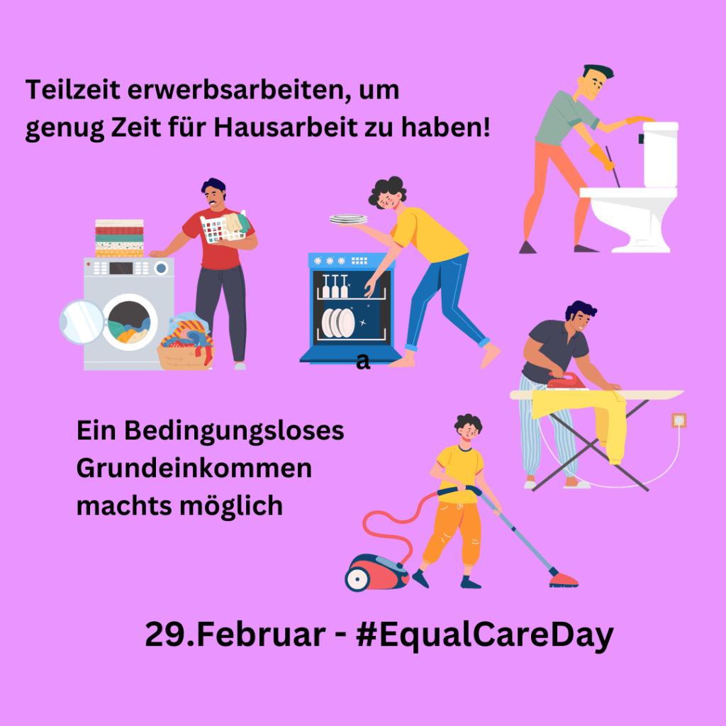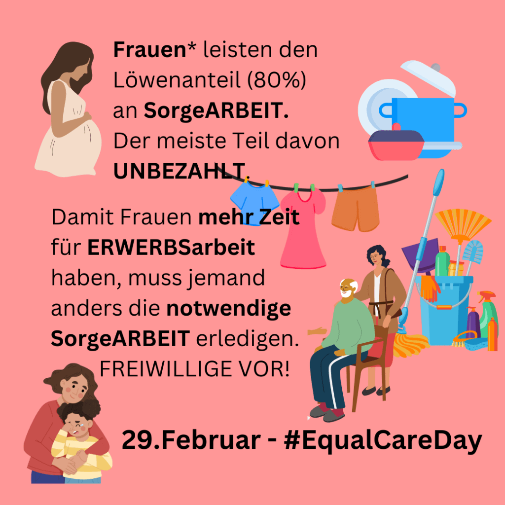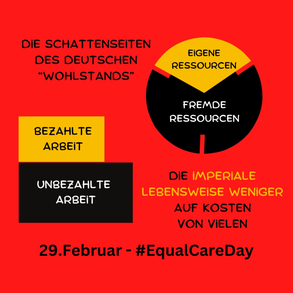 Carearbeit muss wertgeschätzt werden als Grundlage alles anderen. Ein Datum, das daran erinnert und dazu ermahnt, ist der 29. Februar. Dieses Datum findet nur alle vier Jahre statt, an einem Schaltjahr. Es wurde bewußt ausgewählt, weil Carearbeit in unserer Gesellschaft so organisiert ist, dass sie zu 80% von Frauen erbracht wird. Es soll damit darauf hingewiesen werden, dass Männer* für die Menge an Carearbeit, die von Frauen* in einem Jahr geleistet wird, vier Jahre brauchen, also eben nur alle Schaltjahre das gleiche Ziel erreichen. Unter Männer* passen alle die Menschen, die von Carearbeit anderer einfach gedankenlos profitieren und der Überzeugung sind, sie hätten ein Recht darauf. Wir mahnen auch, dass unser Wirtschaftssystem gedankenlos Wohlstand auf Kosten der kommenden Generationen und der Menschen aus anderen Teilen des Planeten schafft, indem für Warenproduktion dreimal so viel verbraucht wird, wie uns zusteht. (Als Prozentsatz der Weltbevölkerung).