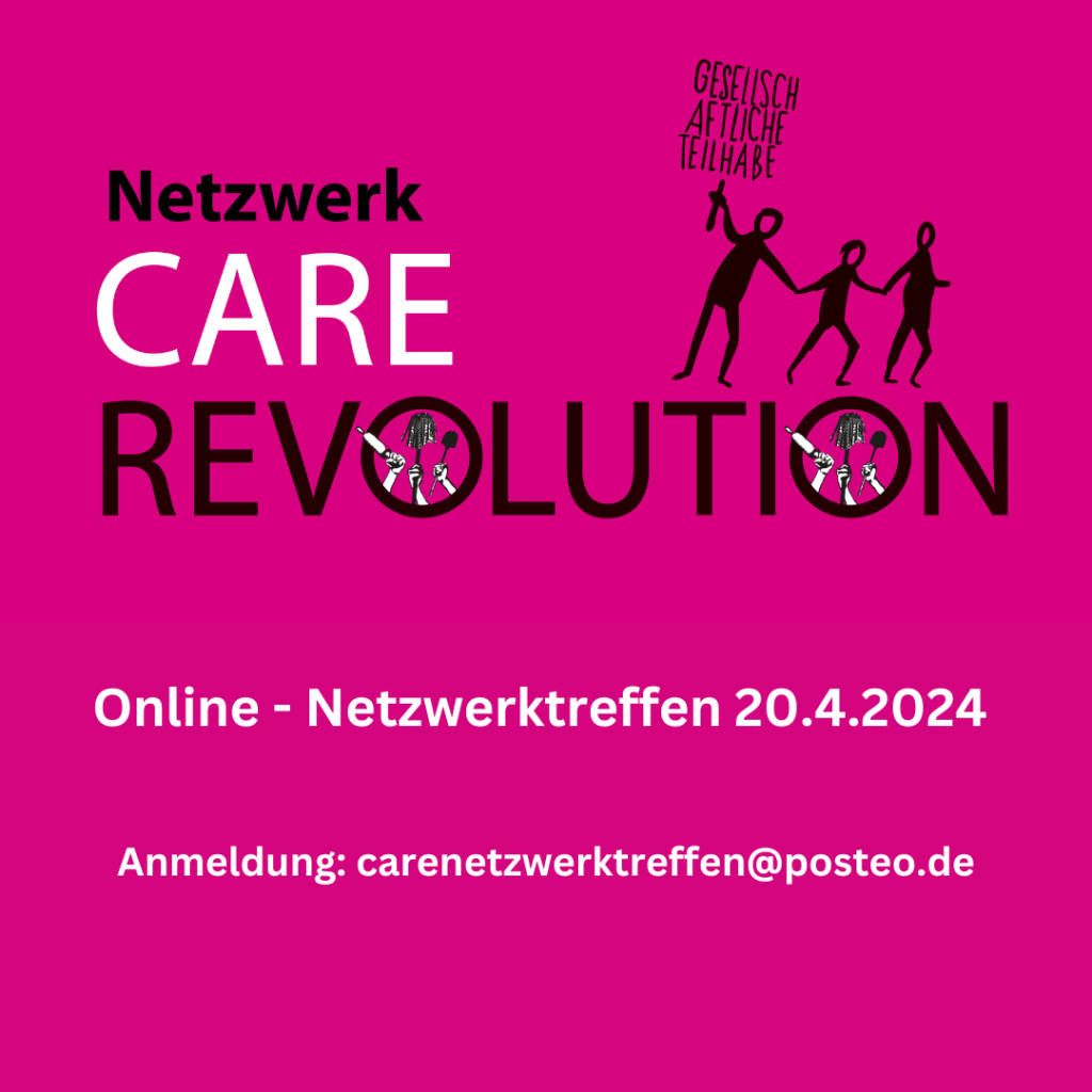 Am 20.04.2024 findet unser nächstes überregionales Online-Netzwerktreffen statt. Wir kommen wieder für einen halben Tag zusammen, tauschen uns aus und planen unsere nächsten Aktivitäten. Im Zentrum steht die Perspektive von gemeinsamen Auftritten und Aktionen, in deren Kern steht: Wir akzeptieren nicht, dass der Rahmen unserer Care-Arbeit und unserer Sorgebeziehungen über unsere Köpfe hinweg bestimmt wird. Dabei geht es uns auch um die Zusammenarbeit innerhalb der gesamten Care-Bewegung.